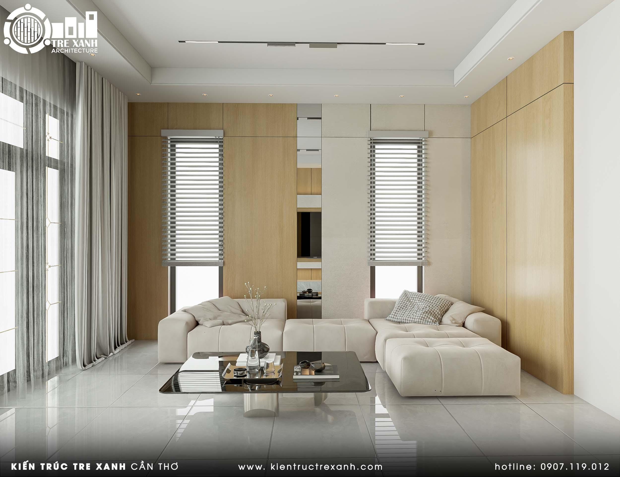 Thiết kế nổi bật với gam màu trung tính, mảng tường ốp gỗ sáng kết hợp chi tiết đá tinh tế. Bộ sofa dáng khối bọc nỉ cùng bàn trà kính đen mang lại vẻ sang trọng mà vẫn gần gũi. Không gian thoáng sáng, ấm áp nhờ hệ cửa kính lớn và ánh sáng trần âm – lựa chọn lý tưởng cho gia chủ yêu thích phong cách “less is more” năm 2026.