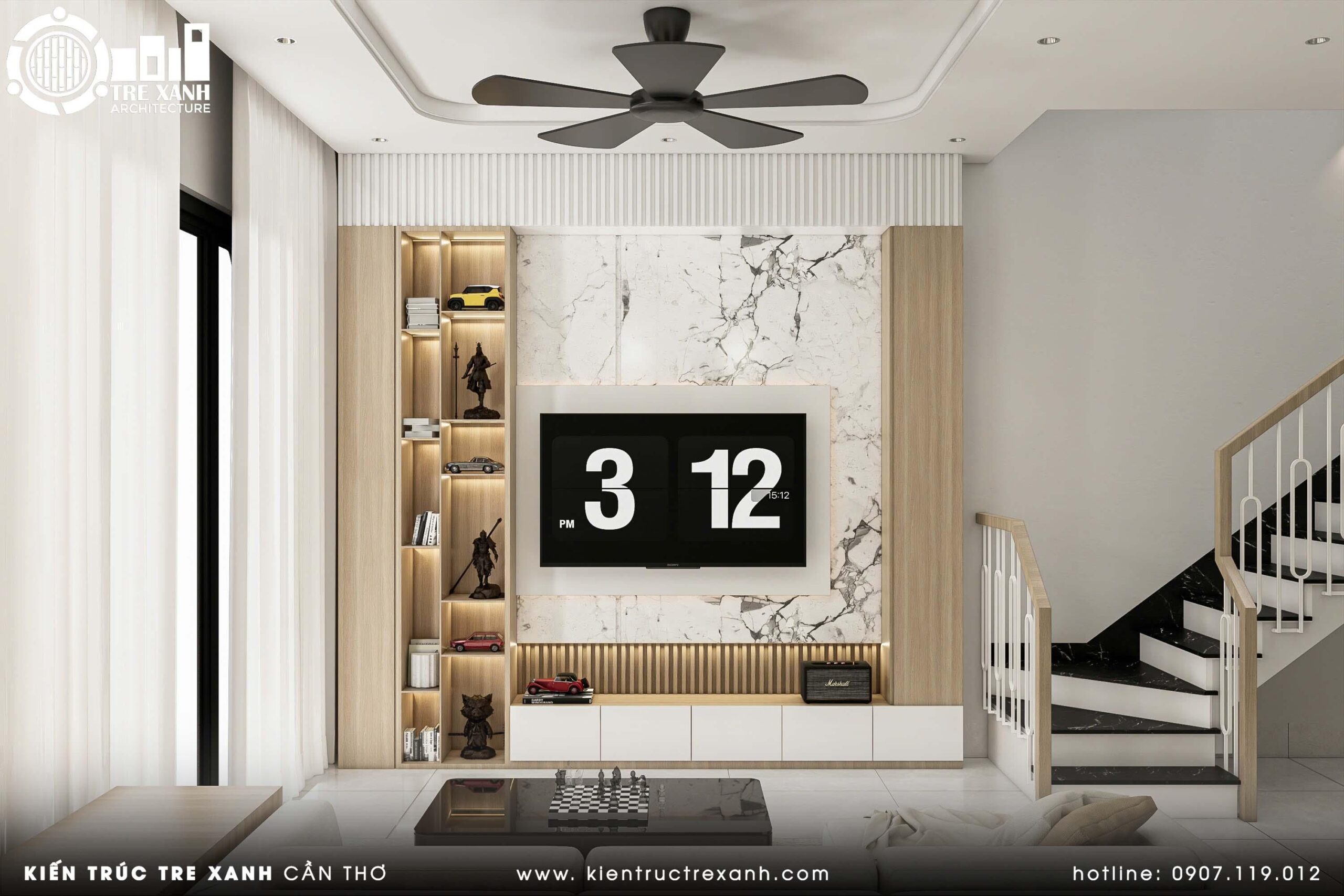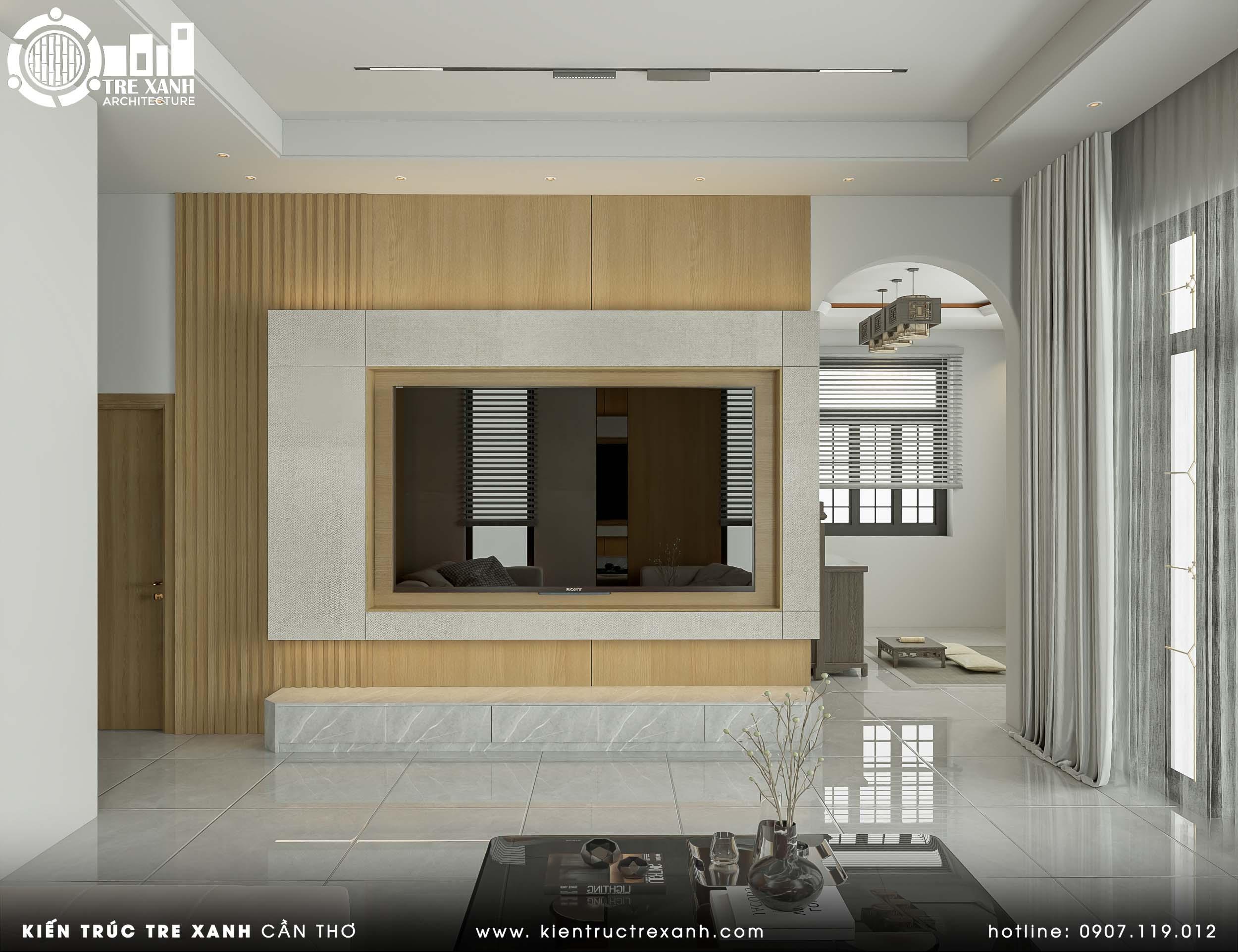 Không gian được dựng lên từ bảng màu trung tính – trắng, be và gỗ sáng – kết hợp với các mảng ốp đá vân nhẹ tạo điểm nhấn sang trọng, tự nhiên. Điểm nhấn thị giác là mảng tường tivi ốp đá và kệ âm với ánh sáng LED tinh tế, vừa trang trí vừa tăng hiệu quả lưu trữ.