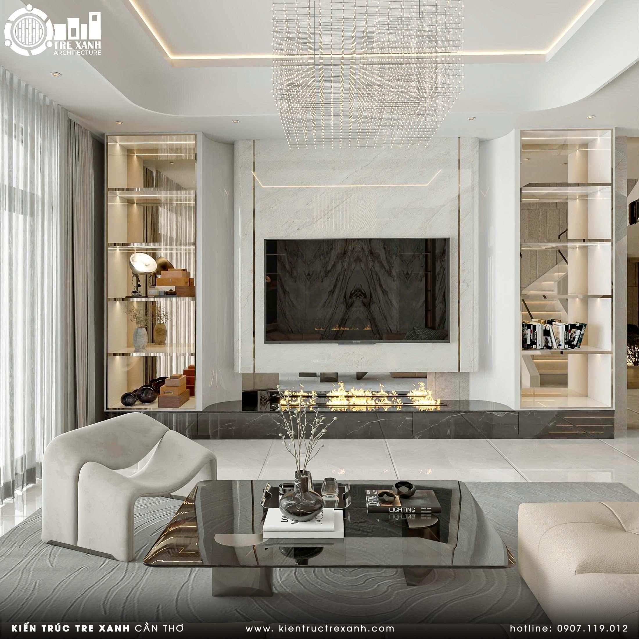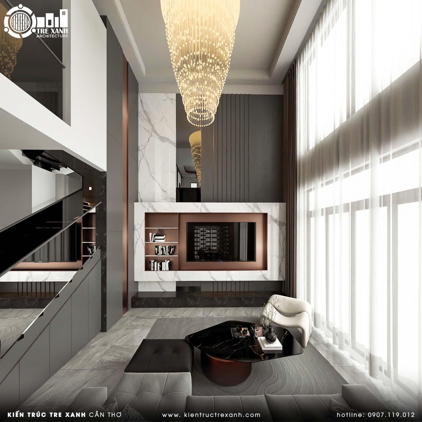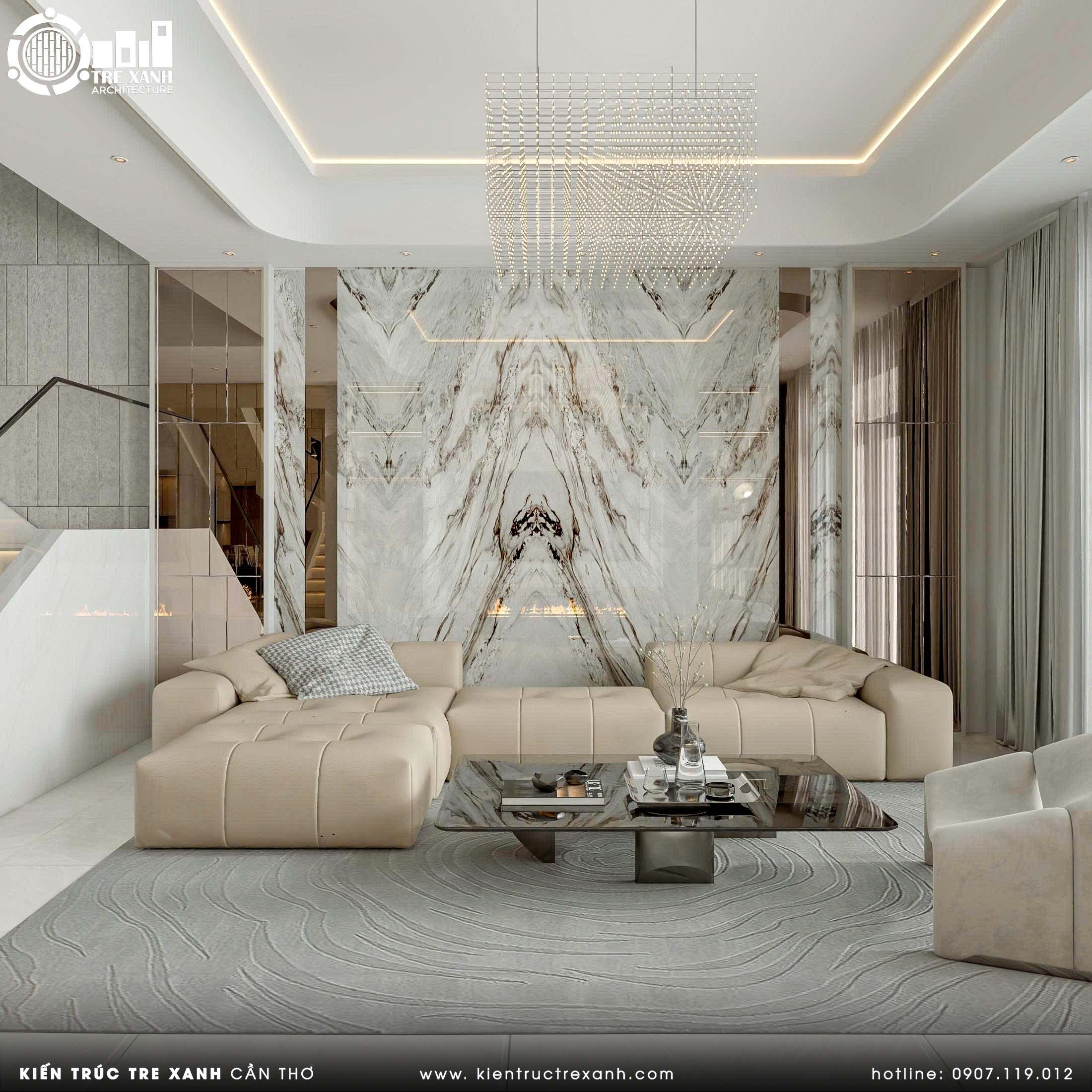 Bên cạnh đó, sự kết hợp của sofa da, bàn trà gỗ và các chi tiết ốp đá sang trọng còn góp phần thể hiện gu thẩm mỹ tinh tế, khẳng định phong cách sống khác biệt và vị thế đẳng cấp của chủ nhân. Đặc biệt, đây là không gian lý tưởng để gắn kết các thành viên trong gia đình, đồng thời trở thành nơi tiếp đón bạn bè, đối tác một cách trang trọng và đầy ấn tượng.