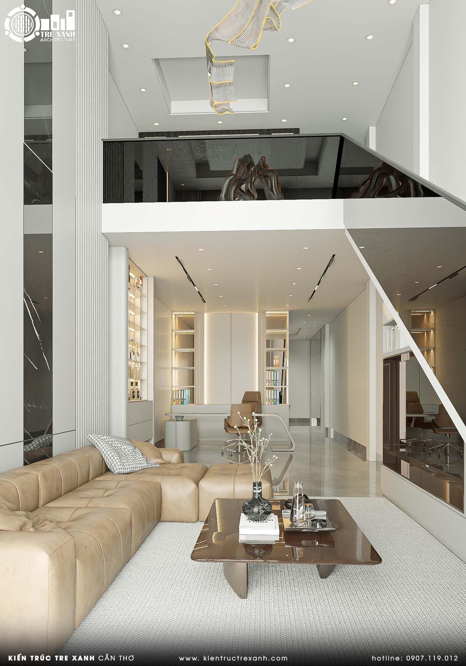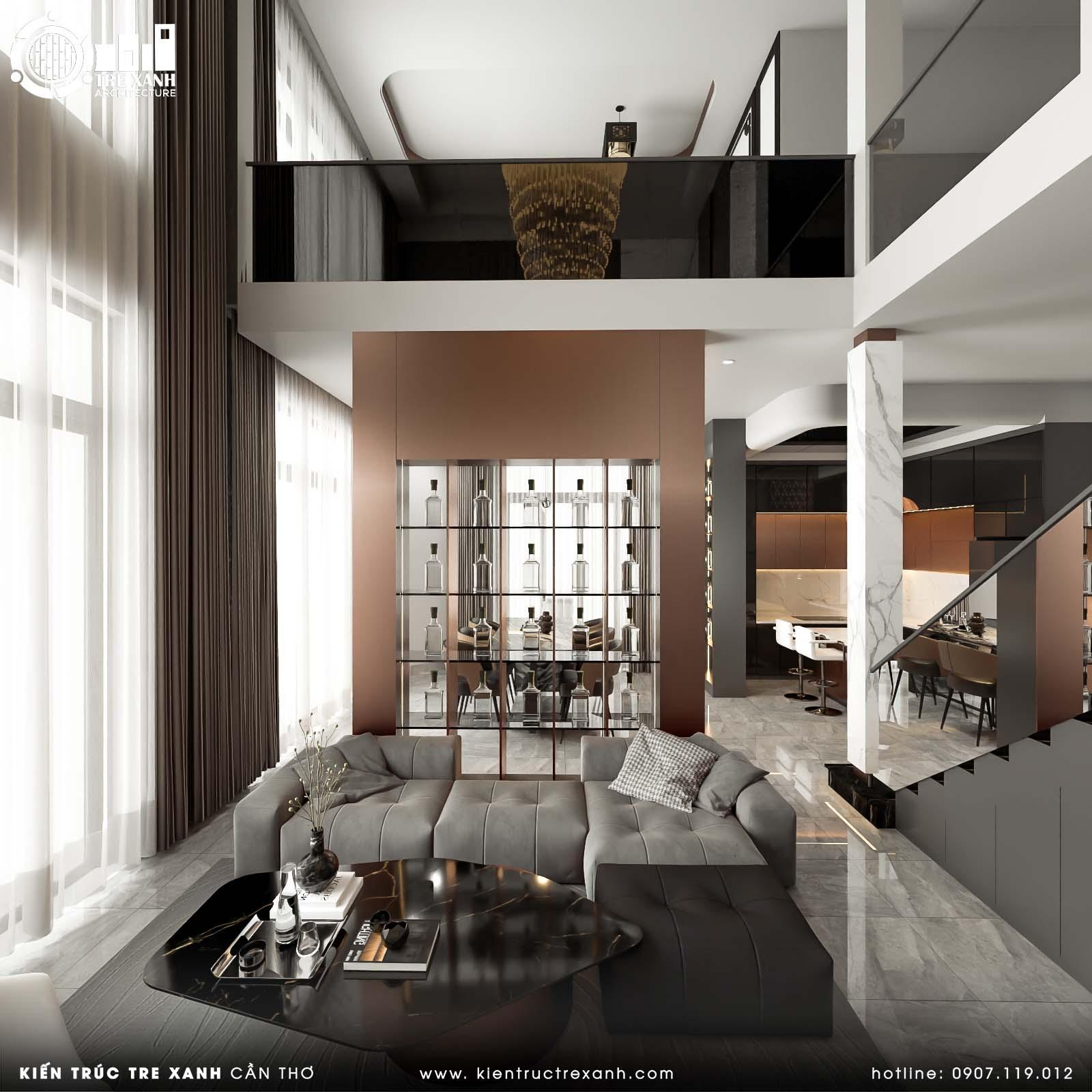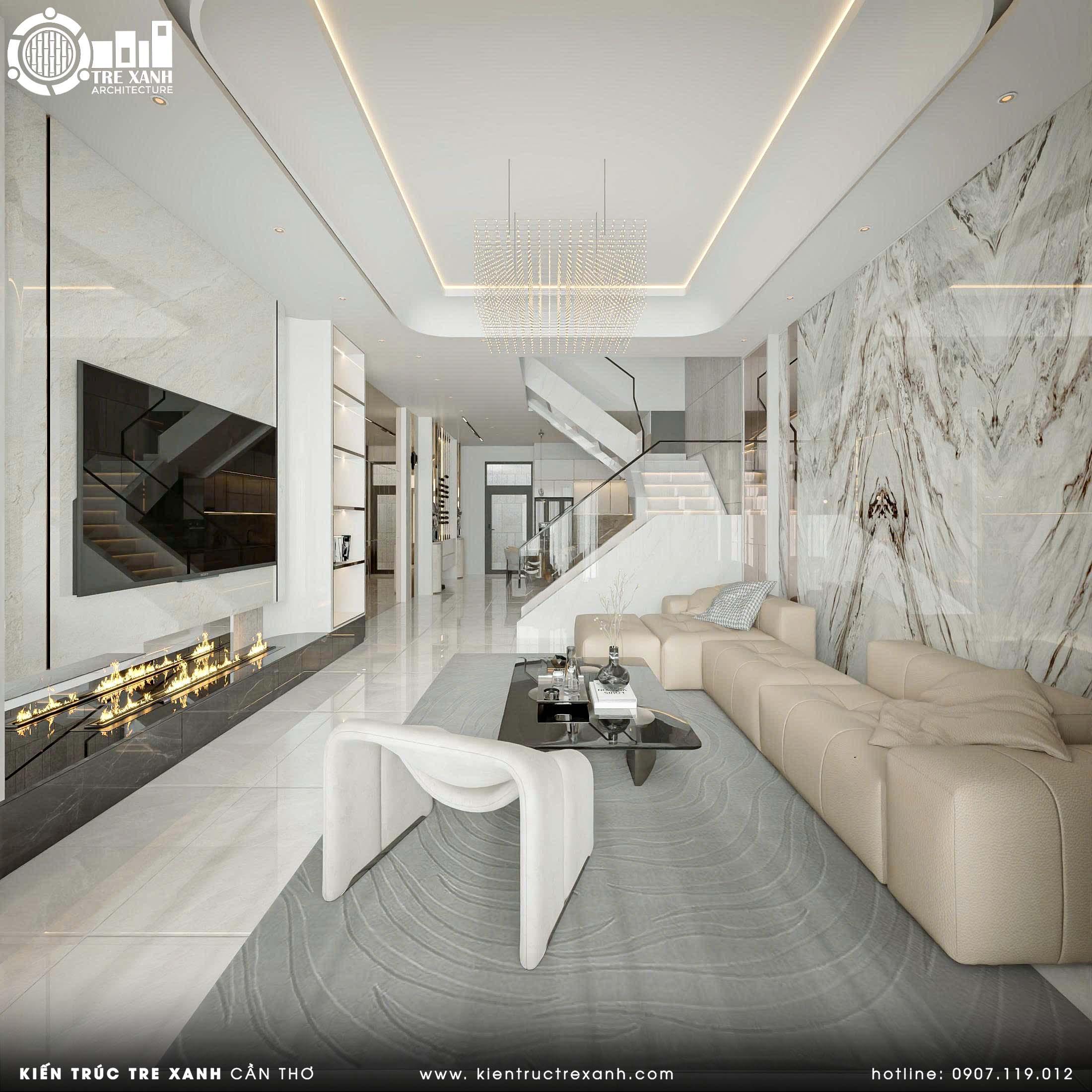 Bên cạnh đó, sự kết hợp của sofa da, bàn trà gỗ và các chi tiết ốp đá sang trọng còn góp phần thể hiện gu thẩm mỹ tinh tế, khẳng định phong cách sống khác biệt và vị thế đẳng cấp của chủ nhân. Đặc biệt, đây là không gian lý tưởng để gắn kết các thành viên trong gia đình, đồng thời trở thành nơi tiếp đón bạn bè, đối tác một cách trang trọng và đầy ấn tượng.