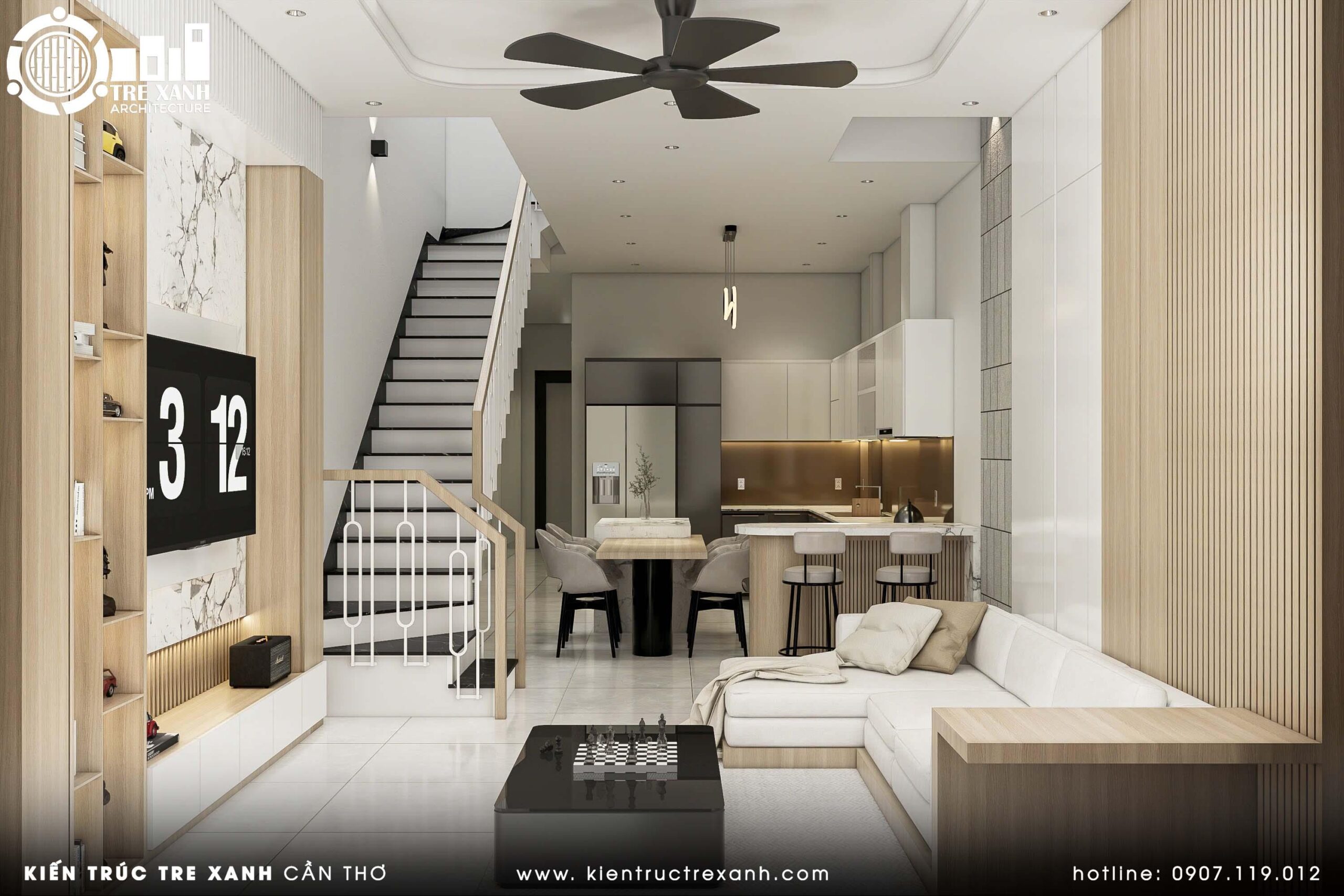 Thiết kế liền mạch giữa phòng khách – khu ăn uống – bếp, cùng đảo bếp và ghế bar, tối ưu hóa công năng cho nhà ống có chiều sâu, đồng thời giữ được sự thoải mái cho sinh hoạt gia đình. Đây là một trong những mẫu phòng khách nhà phố ứng dụng ngôn ngữ thiết kế hiện đại, chú trọng sự tinh giản nhưng vẫn giàu cảm xúc.