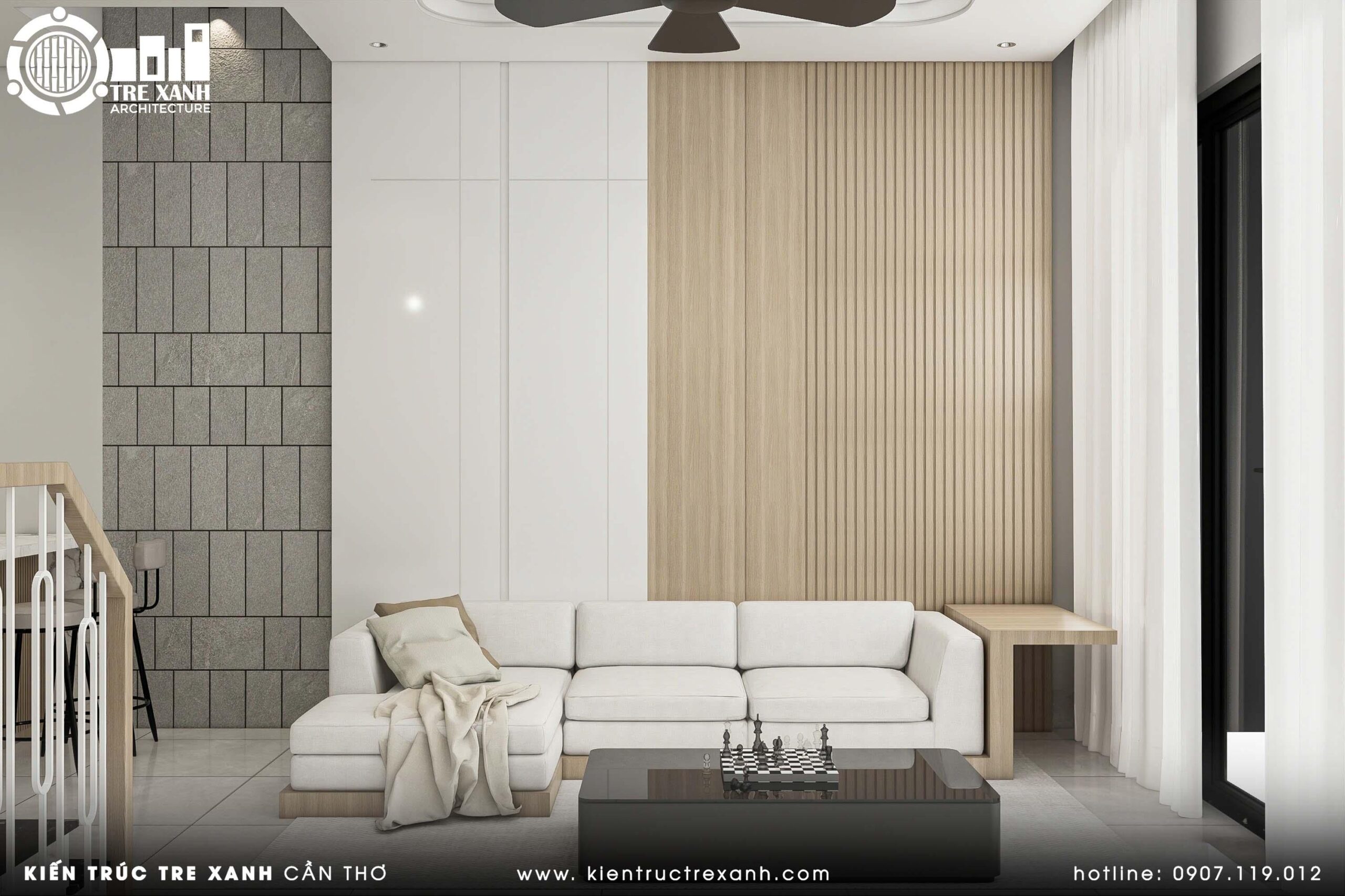 Phòng khách tối giản với điểm nhấn vách gỗ và vân đá